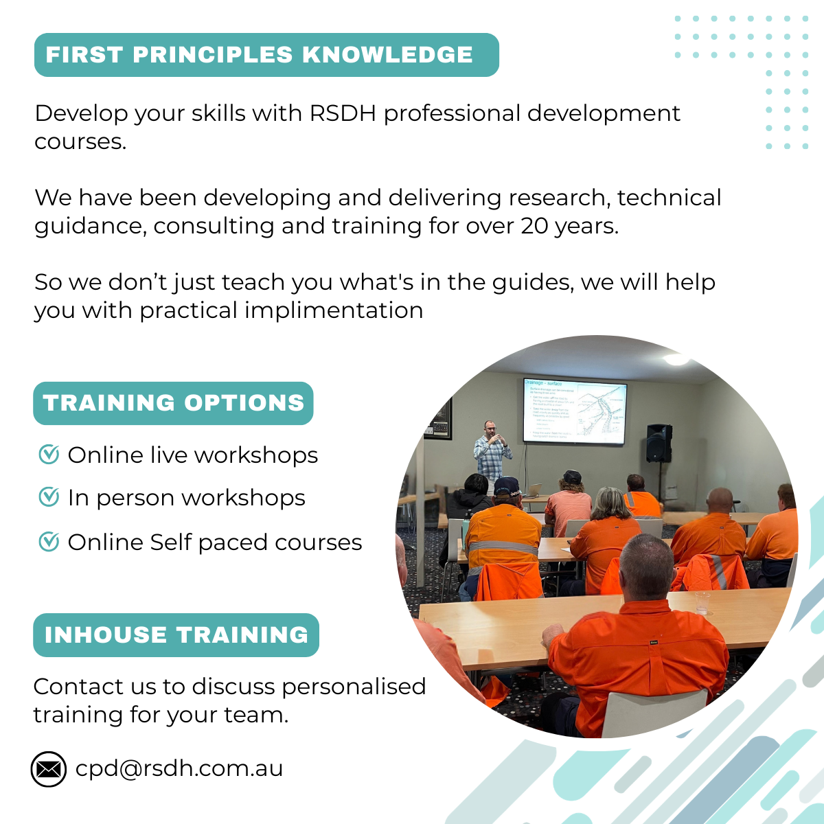 Professional Development RSDH provides Professional Development Workshops for road engineering practitioners.